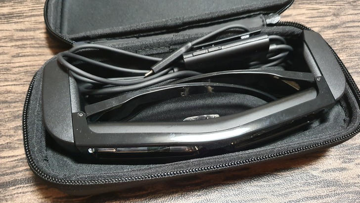 保護殼內的本體一組透過TypeC傳輸線,將支援Display Port輸出的裝置內影像,經由鏡架左右邊各有一台迷你的投影機,將影像投射到半透射的鏡片中,就能呈現影像在使用者的眼前。