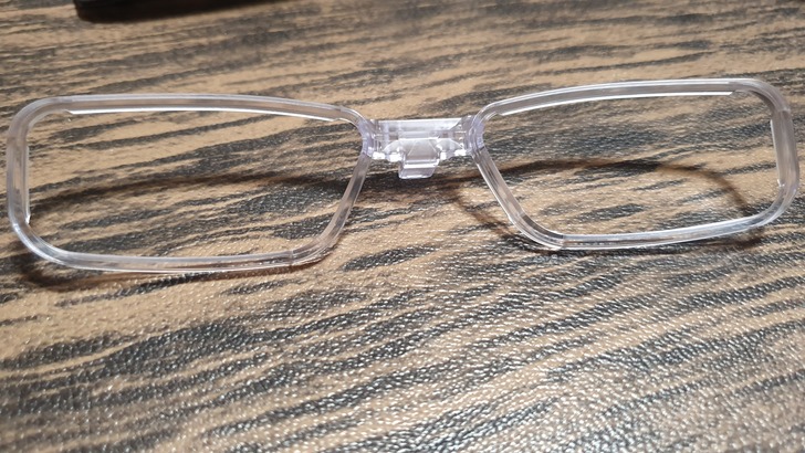 鏡片可以明顯看出兩個特別顯眼的區域,左右兩側的迷你投影機就是將光線投射在這個區域讓使用者可以看見手機裝置內的影像,在這兩個矩形的區域旁邊則是一般的鏡片,讓使用者在看手機影像之外也可以注意到外在環境的變化。