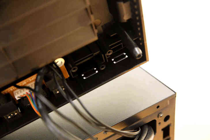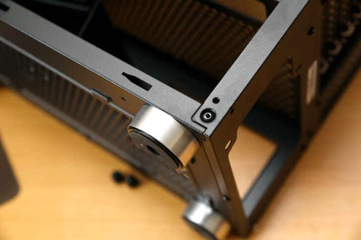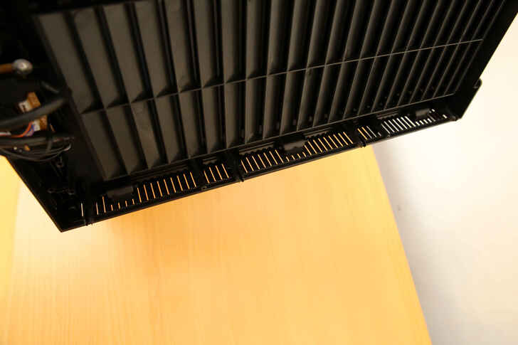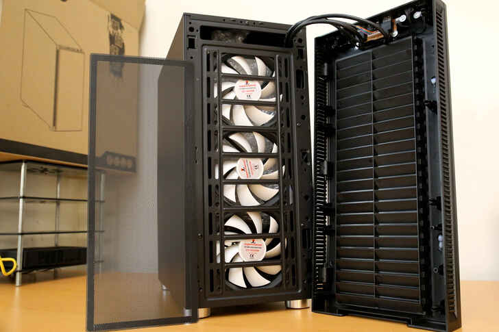 左右兩側以及下方的開孔位在搭配前三個 120mm 的風扇將外部空氣引入機殼內部.