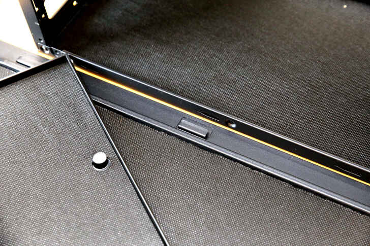 將前面板卸下後可看到前三個進氣風扇有另外設置更綿密的磁吸式濾網來過濾灰塵.