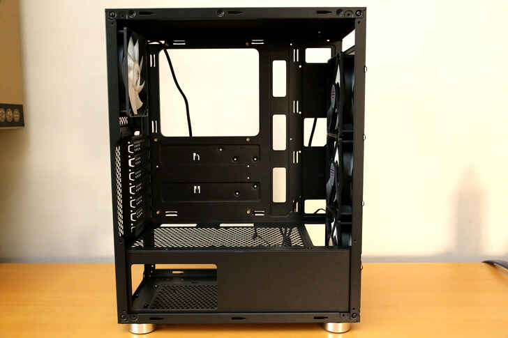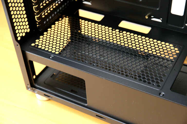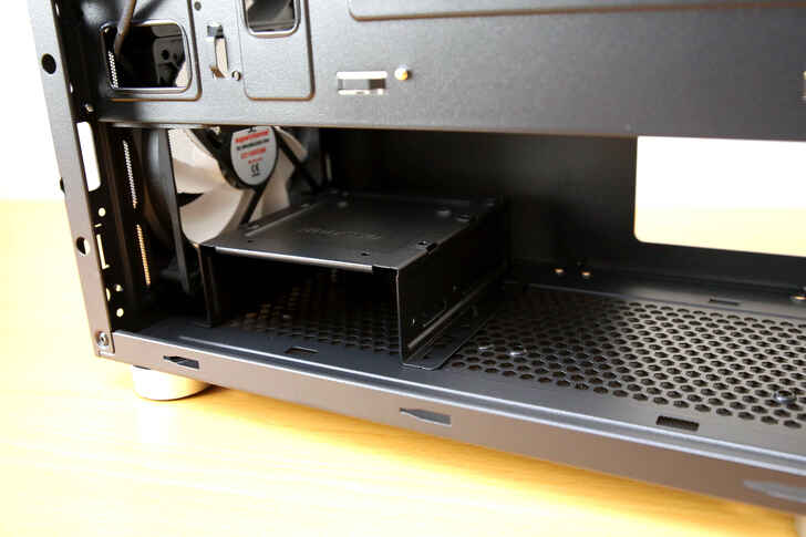 前方滿配三個進氣風扇, 預留的空間亦可加裝水冷排改裝, 另外搭配遮罩沖孔的設計, 下方的硬碟將能獲得更佳的散熱出口.
