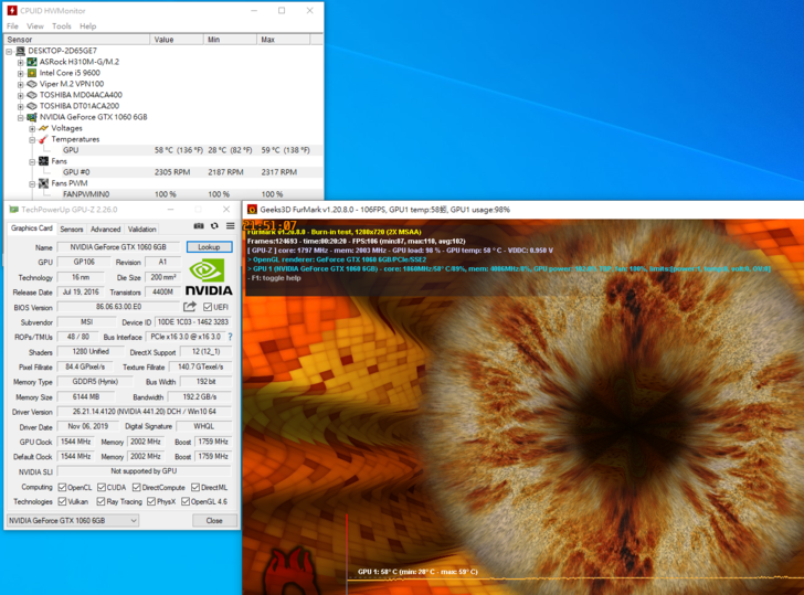 在風扇全速運轉下執行 Furmark 約20分, 最高溫度平均穩住在59左右, 靜音機殼配置三進氣風扇還是有用的.