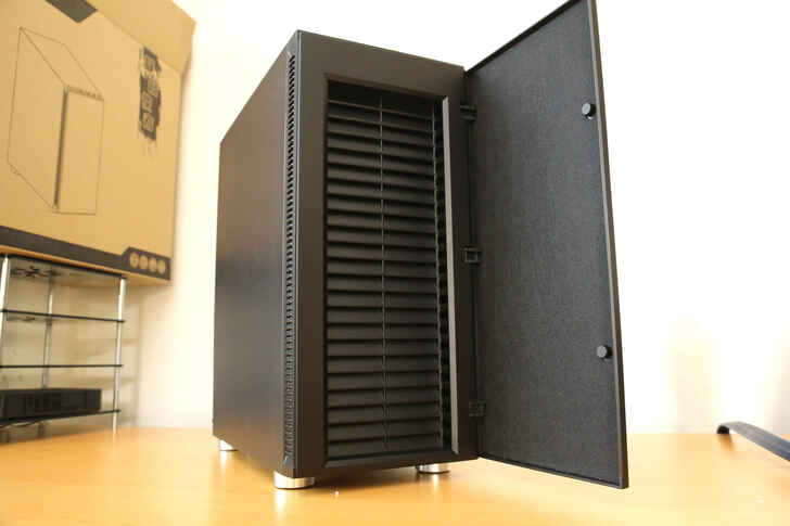 前面板一樣設計成有冰箱門內有百葉窗造型, 前面板內側設置成本較高的隔音墊, 因為便宜的隔音棉會掉屑屑造成零組件損壞, 門板是使用磁鐵來做門檔吸附固定.