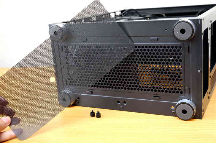 底部設置簡易型的防塵濾網, 四個腳墊的外表有金屬拉絲, 質感增添不少.