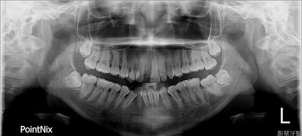 眼前X光片裡可以看到左右兩顆強而有力的智齒正推擠前方臼齒,