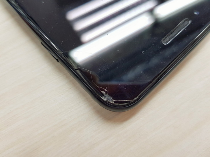 ▼ 再看看這支 iPhone 7+,雖然是滿版保護貼,但是沒有裝保護殼,輕輕一摔雖然沒傷到機身,但是保護貼已經破裂。