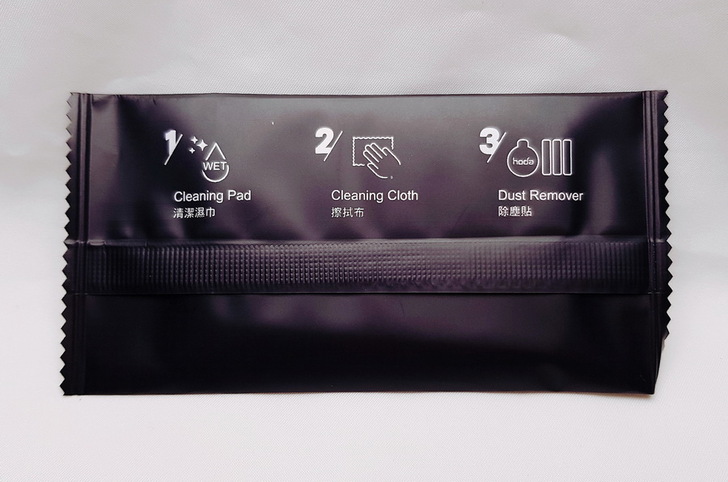 ▼ 配件包的正面跟背面,背面則是列出步驟 先用清潔濕巾 → 再用擦拭布 → 再用除塵貼。