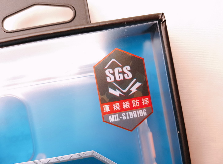 ▼ 包裝正面 - 正面透明的包裝,直接就可以看到 保護殼,右上角則是貼有 SGS 美國軍規級防摔認證。