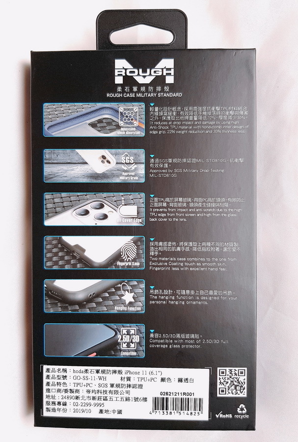 ▼ 包裝背面 - 除了列出柔石軍規防摔保護殼的特色外,同樣清楚列出 製造年份及產地。