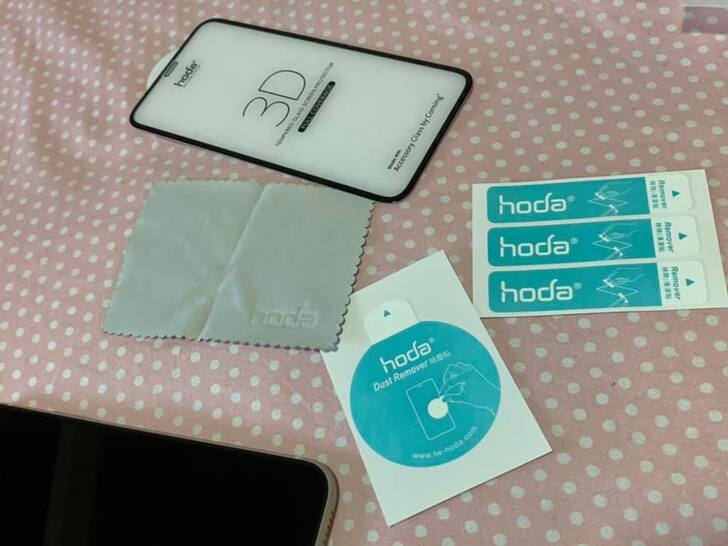 原來hoda 3D 康寧玻璃保護貼裡面配件除了保護貼、鏡頭貼外,還有一包黑黑包裝的除塵貼、拭淨布、清潔棉片,讓愛DIY的我可以大顯身手一番啦~哇哈哈!