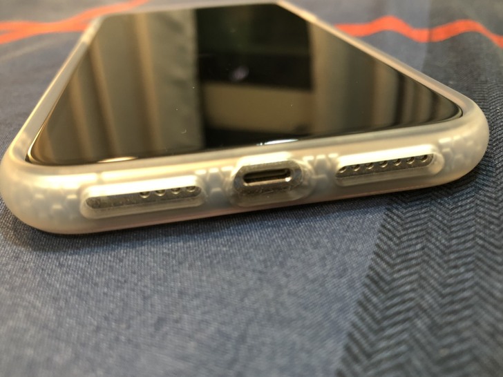 手機殼底部的開孔相當準確,充電孔的地方大小也剛好,不會影響充電頭的拔插