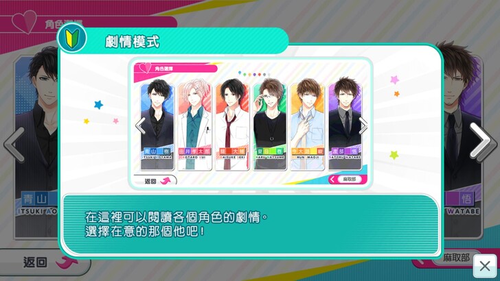 此款手遊個人覺得偏向劇情模式,分為主線劇情、個人主線劇情和活動劇情…等,以玩家為女主角因特殊體質被招攬到麻取部,借由招募人才開始一連串的故事,每個型男角色都有優質的配音,搭配各自的羈絆故事讓玩家可以體驗與型男的親密互動。