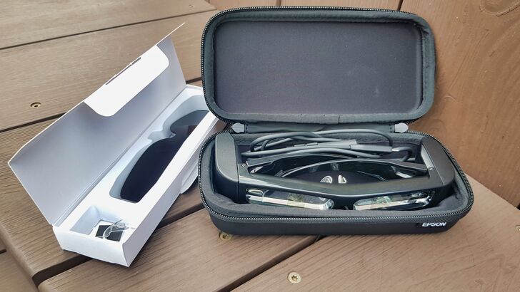 打開後,智慧眼鏡是用強化保護殼裝著的,附件有遮光用墨鏡、專用眼鏡框(可拿去眼鏡行裝配適合自己度數的鏡片)及加長型鼻墊(戴一般眼鏡者使用)