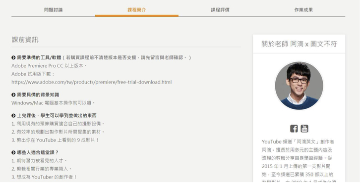 在教學簡介的地方也有課程相關資訊,下載哪種程式去運用,不怕在課程結束之後沒辦法做訓練,或是不知道應該怎麼剪輯,這點我覺得是蠻貼心的。