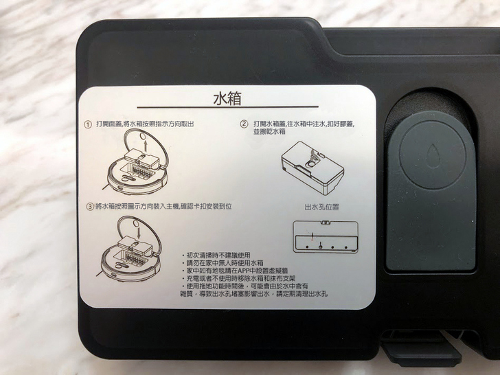 吸、掃完畢後,就要來拖地囉,Proscenic M7的掃拖功能是分開進行,我個人認為分開的好處是因為機器人來回的清掃難免有部分區塊重疊,如果先掃過的地方又拖了,那麼邊刷沾到水後又會將灰塵又帶至別處,造成環境更髒亂。使用拖地抹布也很簡單,水箱裝水之前先詳閱廠商的小叮嚀喔!