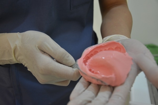 挑選好牙托後在牙托上抹上一層粉紅色厚厚塑模膠