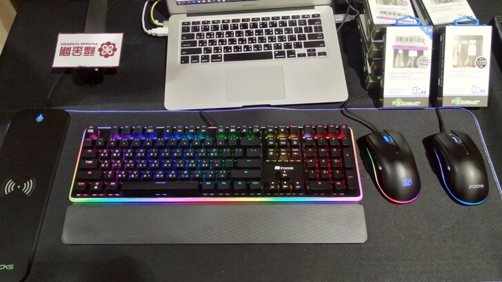 i-Rocks鍵盤滑鼠,下方的C16E滑鼠墊除了有RGB外,還有無線充電功能,上方的感應式按紐(指紋圖示)可切換滑鼠墊RGB色彩,以及顯示充電狀態。