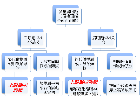 所以林仲樞醫師我個人當諮詢老化性上眼皮和前額拉皮時有一套標準,由於漂亮的眉眼距大約在2.4-2.5公分左右,所以先以這個標準做提眉手術的依據,然後再參考患者有沒有提眉的習慣或是代償動作。如果沒眼距已經超過標準,就不應在建議他們接受拉皮手術。但是,由於在老化性雙眼皮的術後眉毛通常都會變低,這類的患者,如果在標準以下或是有明顯的提眉動作,拉皮是較正確的選擇。
