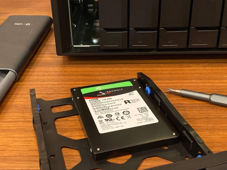 這次測試選用 Seagate IronWolf 110 SSD 240GB 一顆,現在 NAS 安裝硬碟基本上都是免螺絲、免工具了,不過安裝 SSD 還是需要鎖一下螺絲,確保安裝位置穩固。
