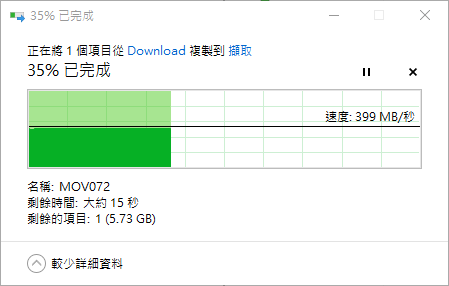實際檔案傳輸部分,以一個約 9GB 的影片檔,全程大約可保持 400MB/s 的傳輸速率,大約不到 30 秒就完成了。