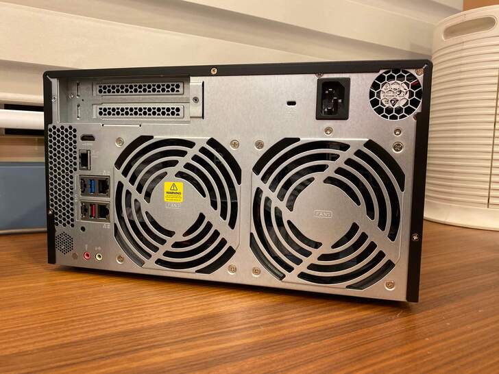 背面就更厲害啦,首先左上方有 M.2 PCIe (Gen 3 x2, 2 GB/s) NVMe SSD 雙插槽,可以依照需求做擴充;接著有 HDMI 2.0 (4K @60Hz) 可以直接輸出影音檔案至大螢幕觀賞;以及單埠四速 5GBASE-T RJ45 (5G/2.5G/1G/100M) 網路孔;其其他則有 USB 3.0、3.1 的 Type A、Type C、兩個額外網路孔以及音源輸入、輸出。
