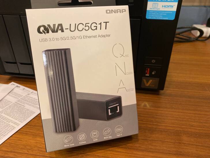 還有也是這次測試的重頭戲、聽說賣很好的 QNAP QNA*-*UC5G1T USB 3.0 對 5GbE 網路轉換器。