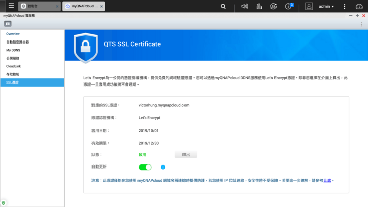 而如果你沒有使用固定 IP 設定這台 NAS 的話,透過 myQNAPcloud 來連接 QNAP NAS 也是非常安全、便利,可以安裝免費的 Let's Encrypt 憑證,就可以在外透過 SSL 連線到自己的 NAS,確保資料的安全。