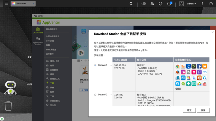 當我們 QNAP NAS 建立了兩個儲存槽以上,安裝套件時可以根據需求,選擇安裝的位置。