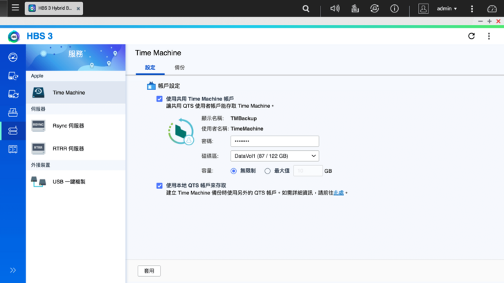 現在一定也有很多朋友跟筆者一樣是 Mac 的使用者,那們肯定知道 Time Machine 有多好用,我們一樣透過 HBS 3 就可以設定好 Time Machine 的儲存空間,在電腦端基本上也沒什麼好設定,把 Time Machine 開啟就搞定了!