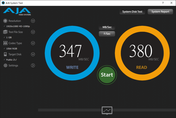 最後來看看大家最關心的效能測試數據,透過 AJA System Test 搭配 Intel Core i7 4770 以及 16GB RAM 的 Windows PC 跑出來的數據是讀寫 380/347 MB/s