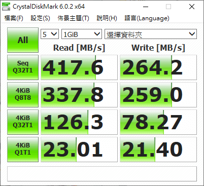 同樣電腦配置搭配 CrystalDiskMark 6.0.2 x64 得出來的數據則是讀寫 417.6/264.2 MB/s