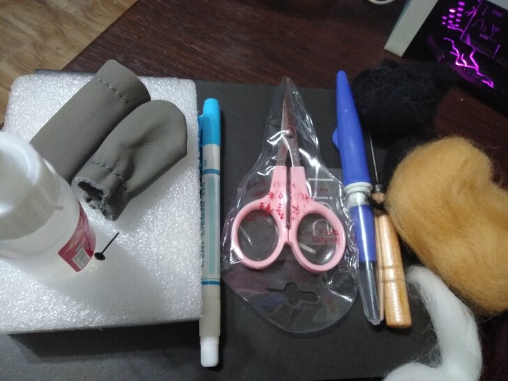 首先要準備的材料有護手套、酒精膠、眼睛一對、鼻子一顆、消失筆、剪刀、戳針、各色羊毛。
