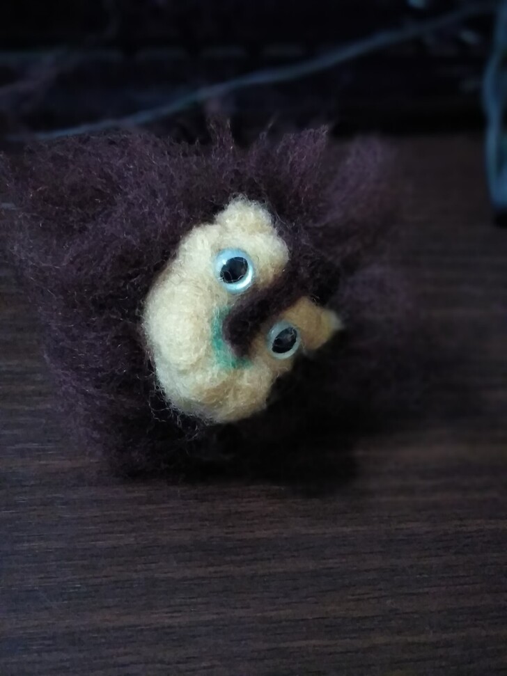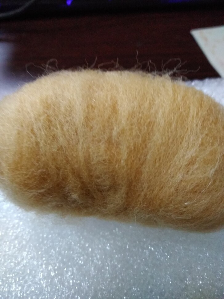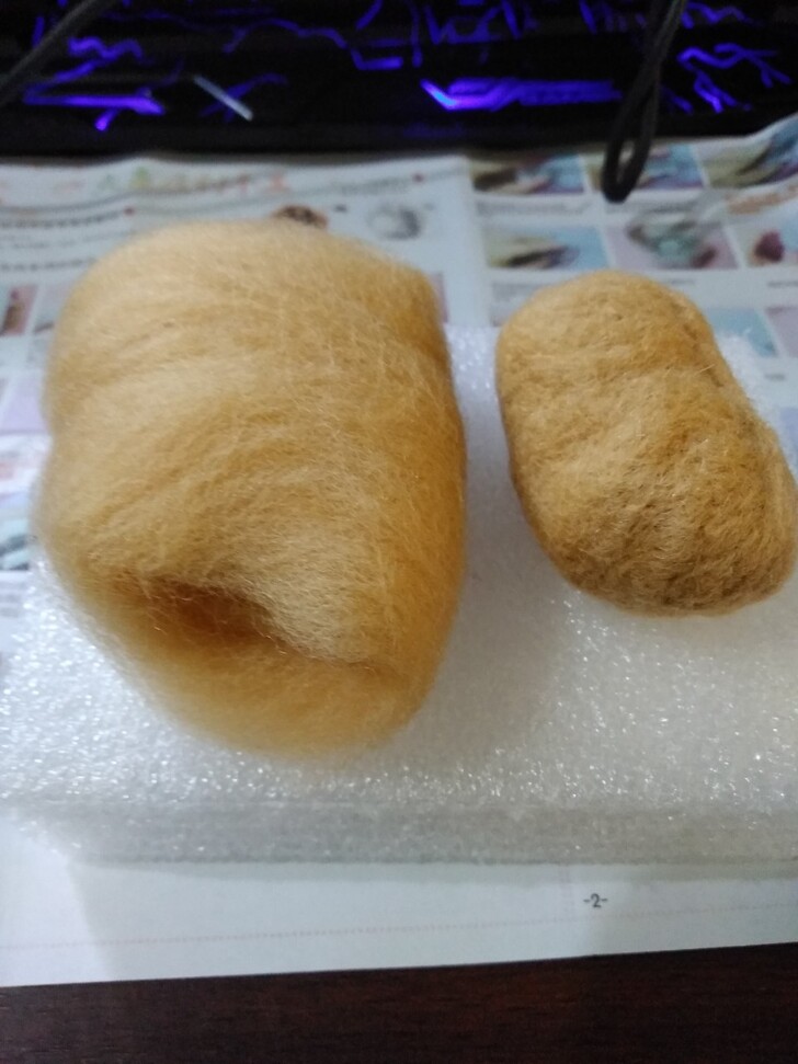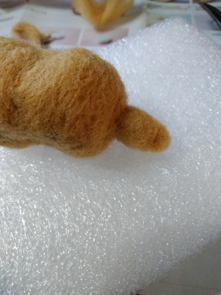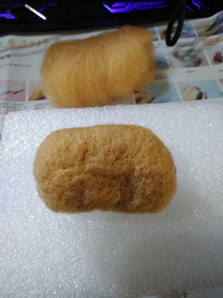 接下來就是把羊毛捲成橢圓形,邊收邊捲才會好看,收好了就把它戳固定。看起來還是很柔順的樣子。