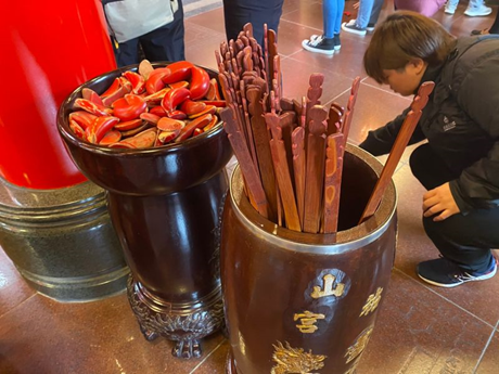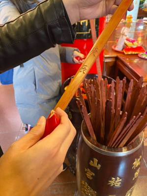 得到媽祖應允的我,可以開始進入抽籤第二個步驟,首先先在籤筒隨意抽出一支籤,並且跟媽祖報告籤號,若是連擲3個聖杯,代表這支籤就是答案,其中只要有一次出現聖杯以外的杯,就是換籤重擲。