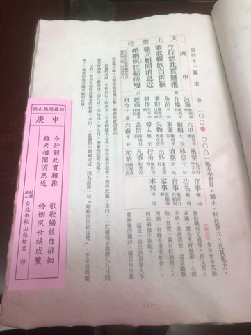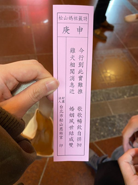 接著就彷彿如有神助的連擲三聖杯,就是它,最後只要去籤箱找籤就可以了,拿著籤看了解籤書上的內容,再次和媽祖致意後就離開了廟宇。