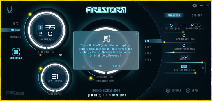 ZOTAC的FireStorm先進微調程式,雖然沒有中文介面,但是簡潔易用,使用者不需煩惱怎麼超頻,只要 OC Scanner 按下去,系統會自動分析你的顯示卡,輕鬆計算出可達的最佳速率。