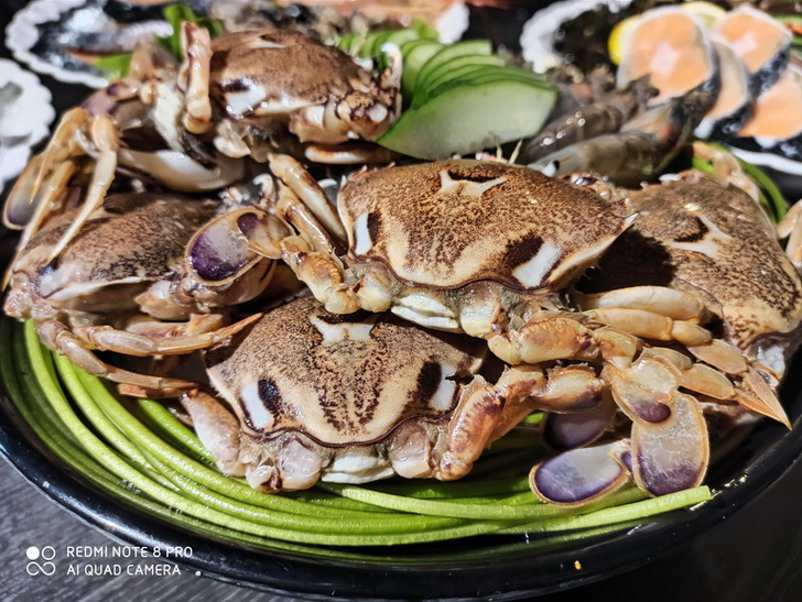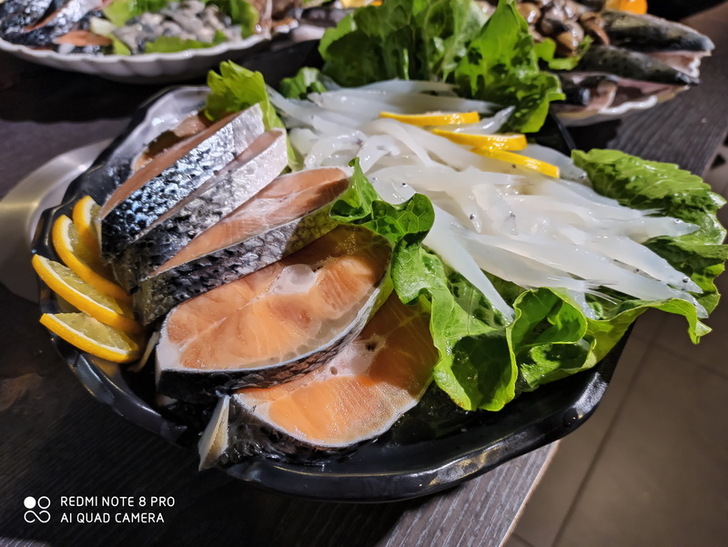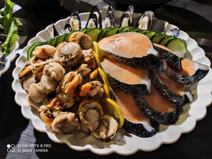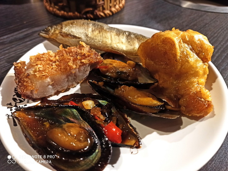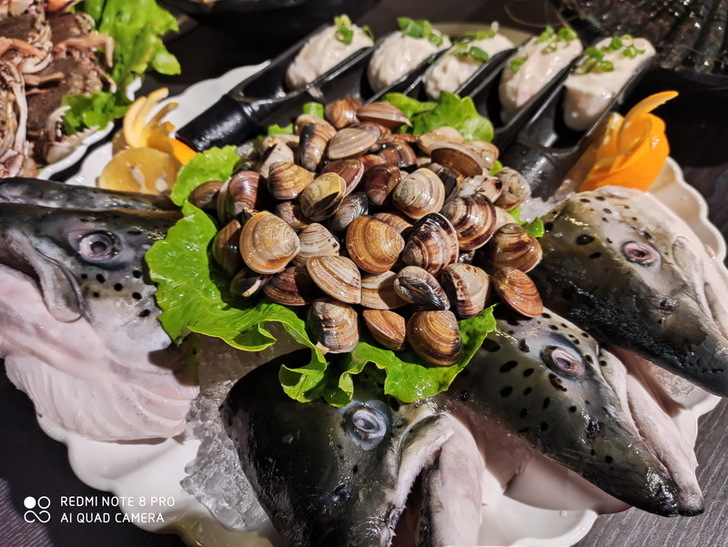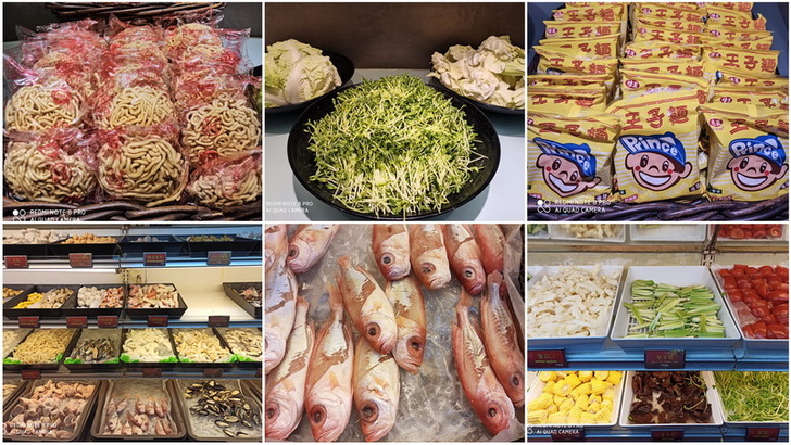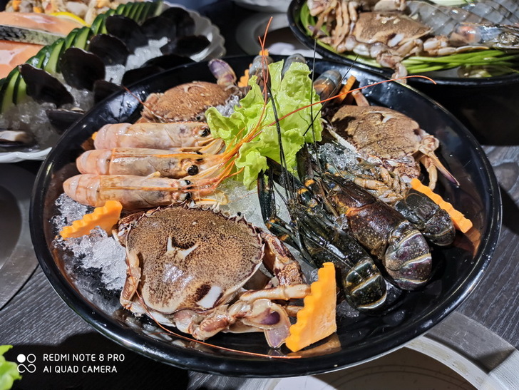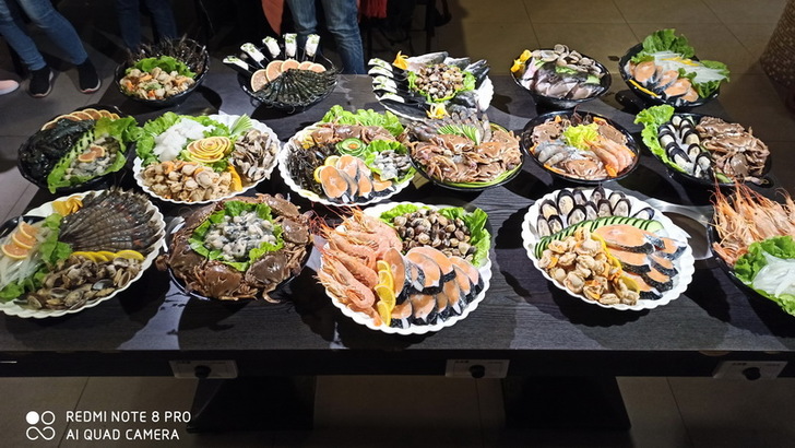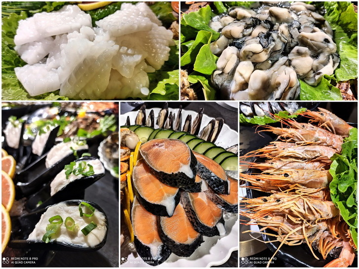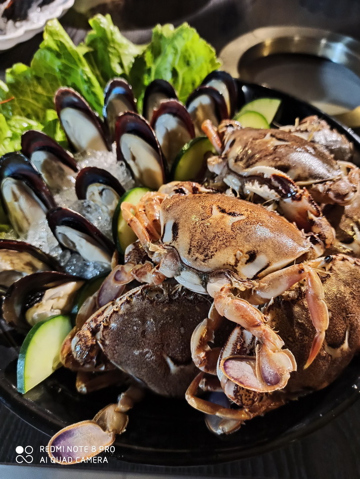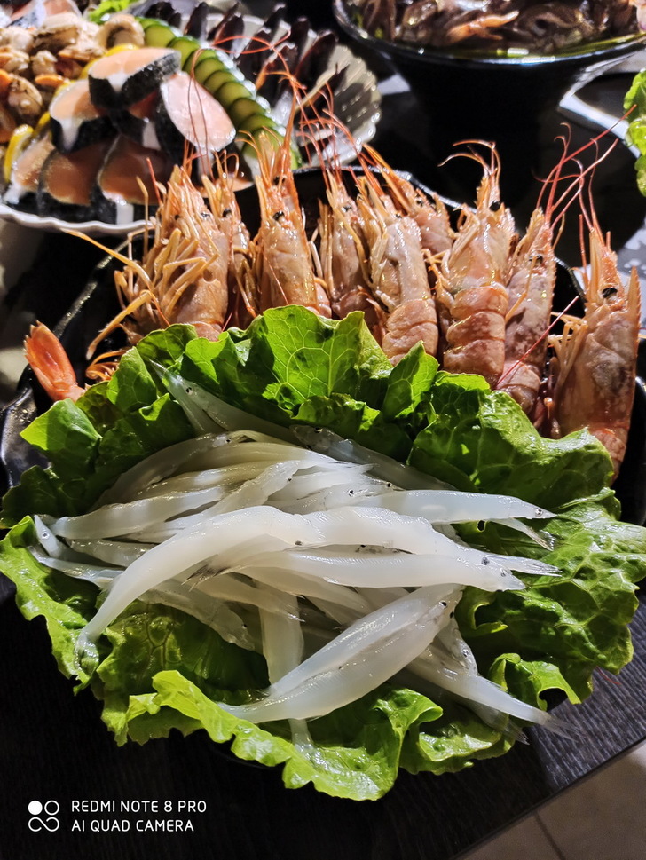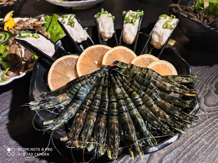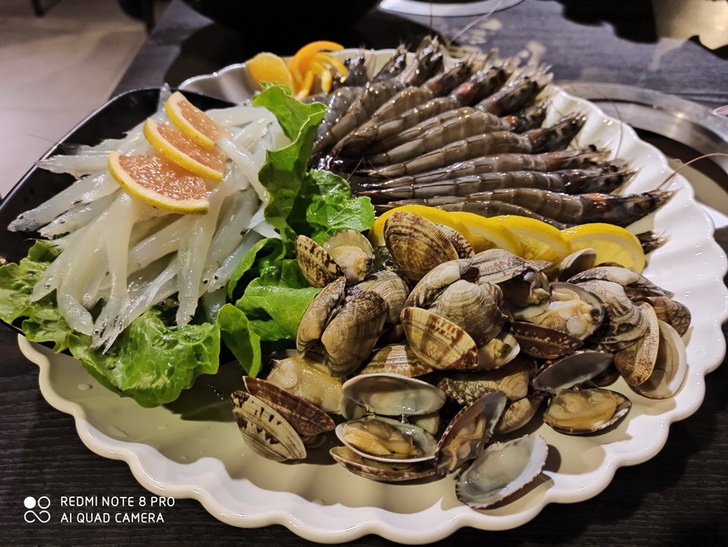 淡水小龍蝦、無污染的奈及利亞草蝦、天使紅蝦、帆立貝、淡菜、鮭魚片、帶肉鮭魚頭、鮮蚵、黃金蟹、三點蟹、銀魚、文蛤、花枝刻花、花枝漿、鮑魚、日本生干貝…….這裡通通吃得到。