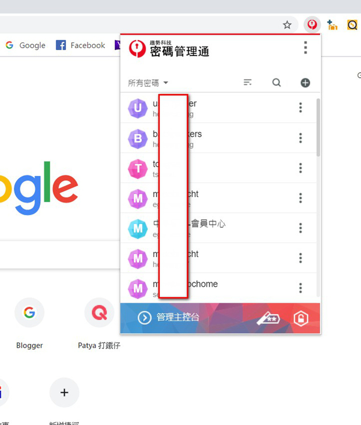 ▲安裝了密碼管理通,每次開Chrome,在網頁列旁會有密碼管理通的工具鈕,就會有已記錄的網站帳號和密碼,只要點想登入的網站,帳號和密碼馬上就寫入並登入,不需要重新打入。