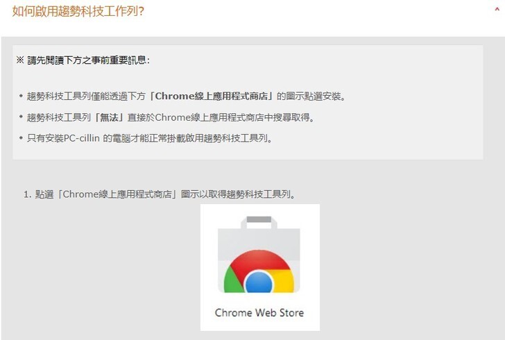 ▲只要你安裝了趨勢的防毒系統,當你開啟chrome的時候,出現了這個訊息,馬上就跳到趨勢工具,而且有圖文的步驟介紹,讓不懂電腦的網友都能很輕鬆的安裝…