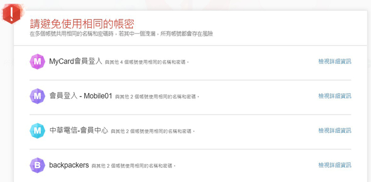 ▲當你執行了密碼檢查,密碼管理通幫你把有問題的密碼分二大類,你也就可以很清楚的了解自己設定的密碼需要做什麼樣的改變