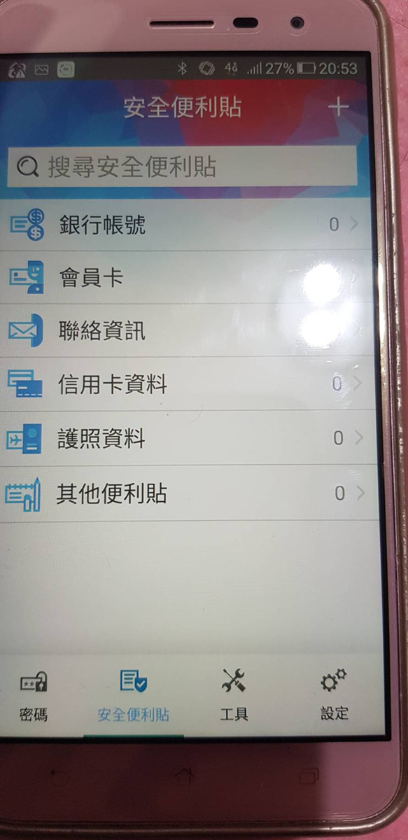 手機版的密碼管理通有【密碼】、【安全便利貼】、【工具】、【設定】,因為【密碼】這個主題跟電腦版大同小異,我就不介紹了。