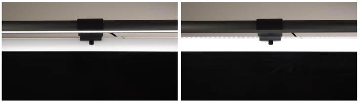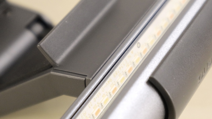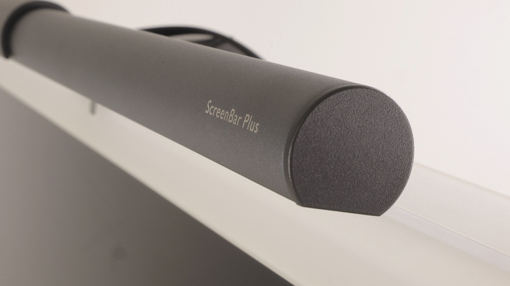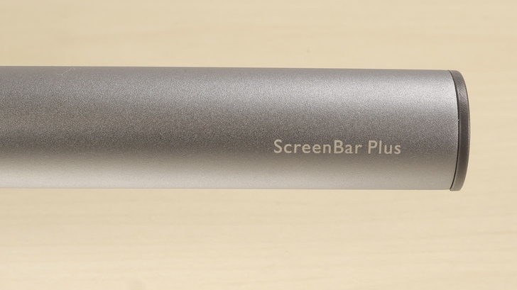 ScreenBar 系列相較一般檯燈,很大的優勢在於其掛在螢幕上非常省桌面空間,一般檯燈為了穩固,基座都不會太小。相比之下,ScreenBar Plus 只有控制盤在桌上,大概與無線充電板佔用的面積相當,非常省空間。燈具的管狀本體是鋁擠型,表面有磨砂處理,金屬質感摸起來很不錯。兩側則是塑膠材質封住,沒有特別用膠固定,也密封得不緊,因此很容易就能拿下了。