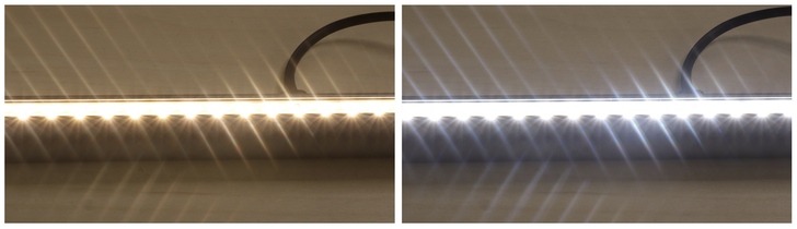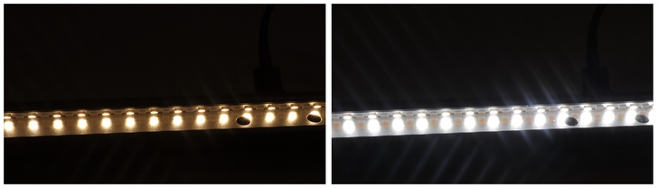 接下來是一系列的燈光展示比較,左側是調到最強的暖黃光,右側是調到最強的白光。