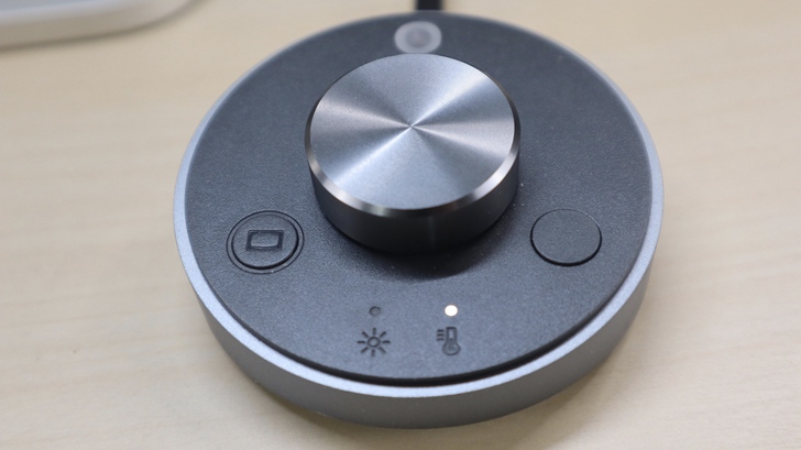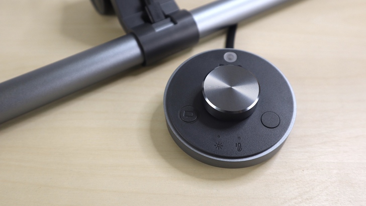 控制盤的設計也很不錯,旋鈕大小適中,可以調整亮度和色溫,透過右邊的按鍵切換亮度與色溫的調整模式。左邊的按鈕則是自動根據環境光設定色溫與亮度,運作時按鍵周圍會亮綠光。