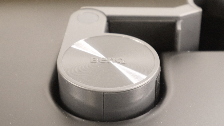 圓形配重體上,兩面都有 BenQ 的同心圓紋路,讓外觀。不過裡面似乎沒有鎖得很牢,如果晃動較大,就會聽到、感受到配重物的搖晃。類似的情況在燈具也有,晃動時會聽到透明塑膠片碰撞到聲音。