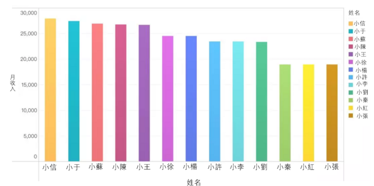 你看到這張圖,直接就會找圖中柱形最高的三個人,省去了腦海中比較資料的步驟,花費時間1秒不到,這就是一個簡單的資料視覺化。