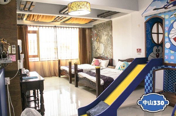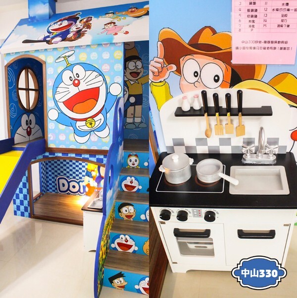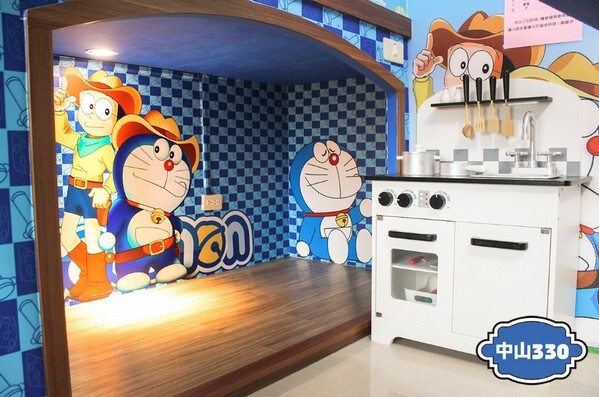 我們訂的這間主題是機器貓,其實就是小叮噹啦!床上還有兩隻很可愛的娃娃,晚上我家小怪獸還抱著一起睡覺呢