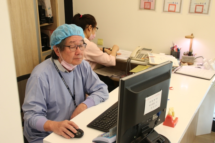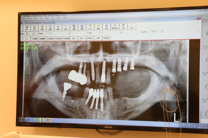別看醫師一頭白髮蒼蒼評估植牙前醫師檢查口腔健康衛生可是非常嚴謹,劉醫師仔細審視X光片再環顧口腔牙齒情況,先替口內牙齒通通清洗一遍之後,才建議那缺很久的臼齒可以做植牙或是牙橋來補缺牙,雖旁邊臼齒有些傾倒,若沒有矯正預算可以不用刻意將倒牙扶正也能做植牙手術,未來只要多加注意清潔就好,然後櫃台護士就會協助說明微創植牙費用及植牙手術療程時間。