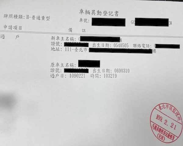 流程都跑完後,整個過戶手續就完整,監理所會提供一份「車輛異動登記書」,代表過戶手續完成,若是汽車新領牌後,3 個工作日內不受理過戶登記。