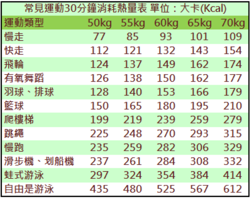 網路上可以查到常見的運動所消耗的卡路里,很多人都會拿來參考再選擇其運動方式,不過同時間進行相同運動,體重較重者所消耗的熱量會比較多。另外使用健身器材的強弱度也會影響總熱量的消耗,強度太輕則無法讓心跳保持在130左右,強度過重則容易造成肌肉疲乏無法持久,進而無法達到成功減重的功效。所以還是老話一句,要養成運動習慣,先從自己喜好、方便性來選擇運動做起步。